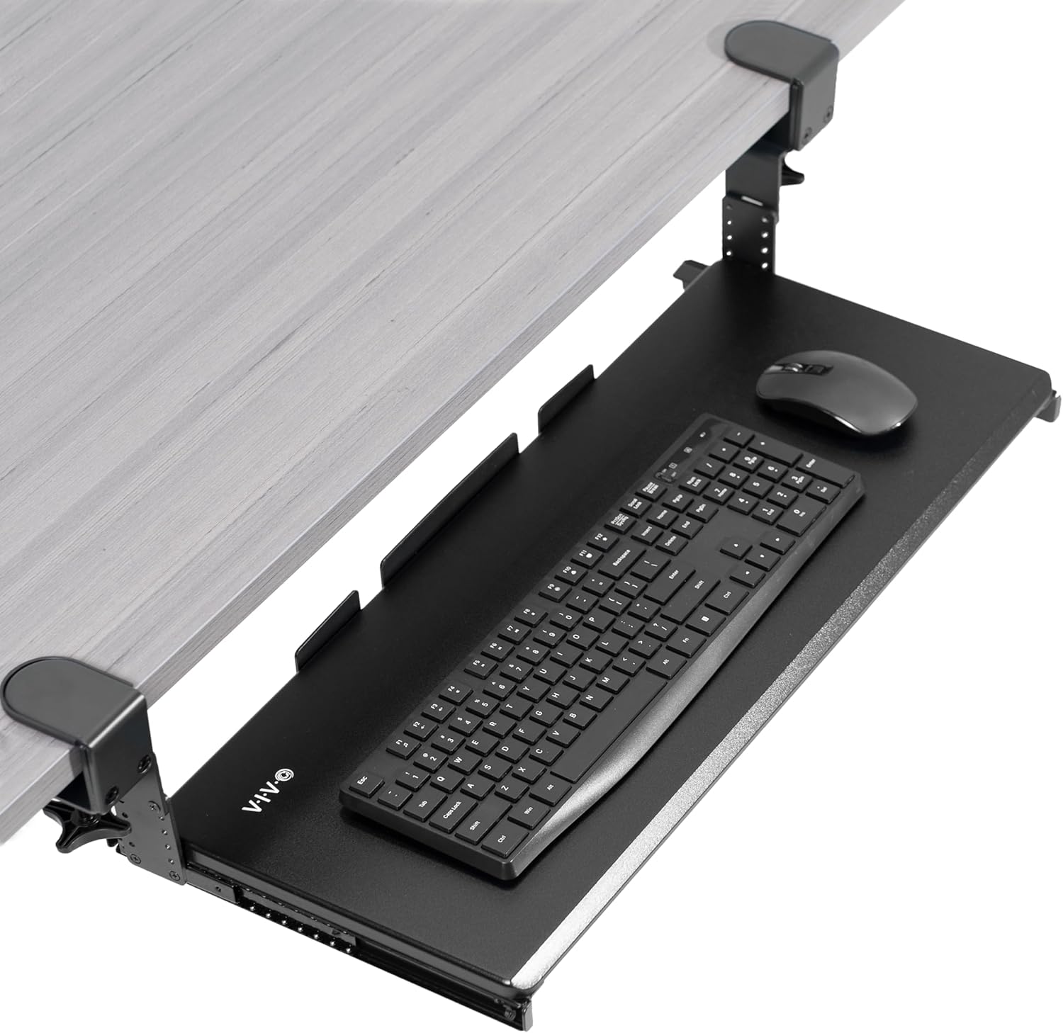 - Save Desk Space - This 26.8" (33" including clamps) x 11" under-desk keyboard tray holds your keyboard, mouse, and other small accessories below the desktop for added work space. Please Note: The total length from clamp to clamp is 33", so please make sure you have that much space on your desk before purchasing. --Patent Pending--