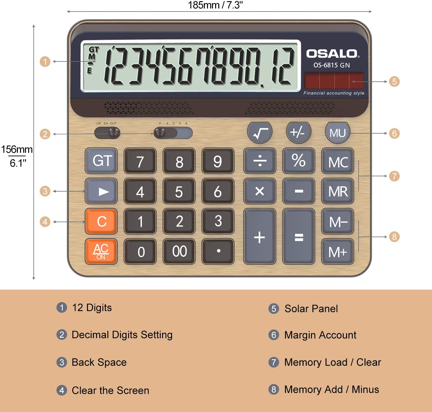 Desktop Calculator Extra Large 5-Inch LCD Display 12-Digit Big Number Accounting Calculator with Giant Response Button, Battery & Solar Powered, Perfect for Office Business Home Daily Use(OS-6815GN)