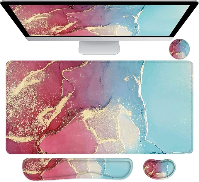 - 【Mouse Pad with Wrist Rests Set】Our large mouse pad and wrist rest set includes desk pad (35.4x15.7 in), keyboard wrist rest(16.9x3.5inch), mouse wrist rest(5.5x3.1inch), cup coaster(3.9x3.9inch). No need to buy them separately, at a super cost-effective price. This desk pad for keyboard and mouse is large enough to fit your mouse, gaming keyboard, and other desk items. Our desk mouse pad can keep a clean, uncluttered desk to improve the gaming experience or work efficiency in the office.