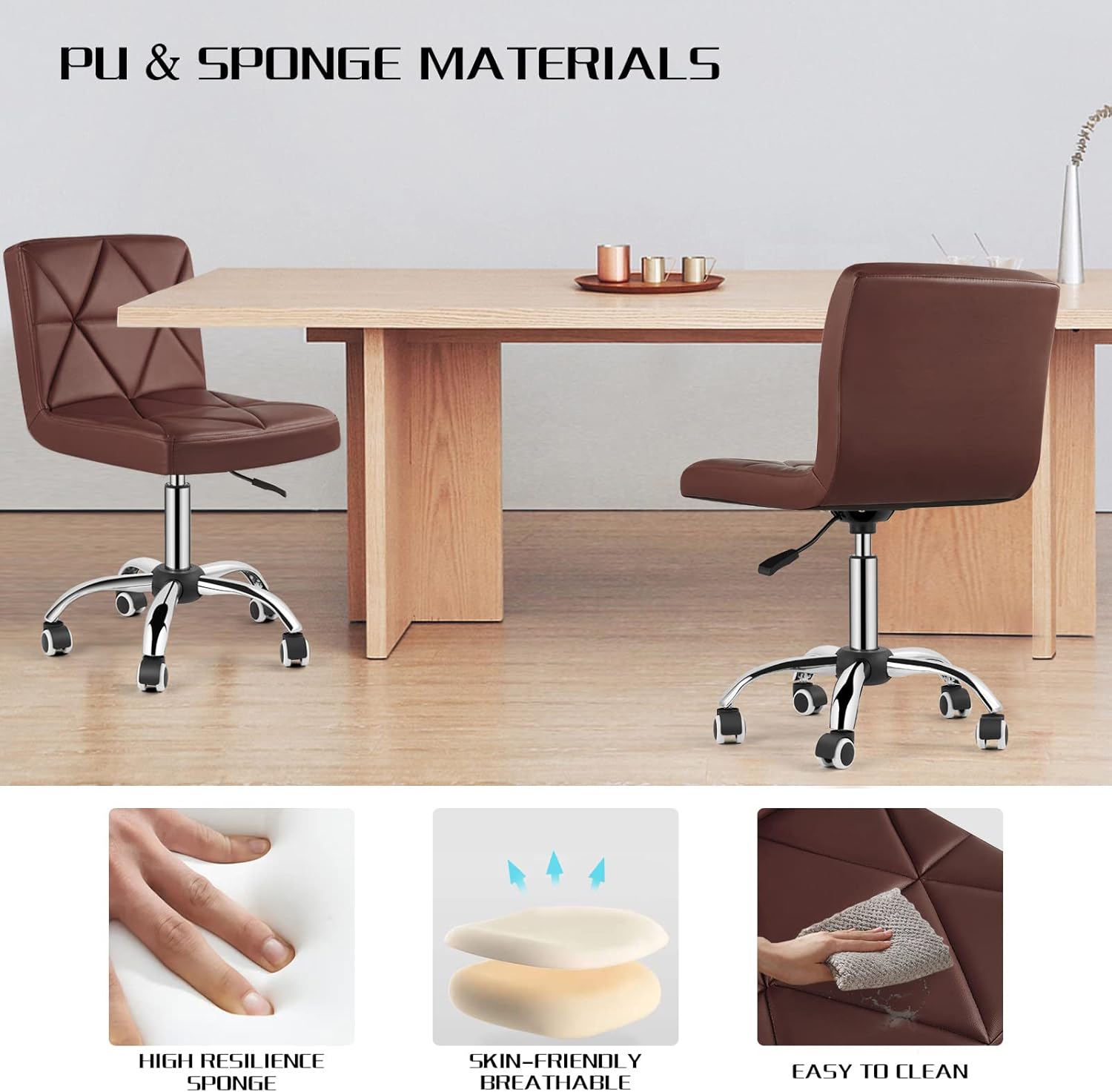 - PU & HIGH ELASTIC FOAM - Made of skin-friendly and breathable material, the mid back task and desk chair is specially designed for your all-day comfort and support. Besides, the waterproof and wear-resistant surface adopts diamond-shaped patterns, which is beautiful and elegant.