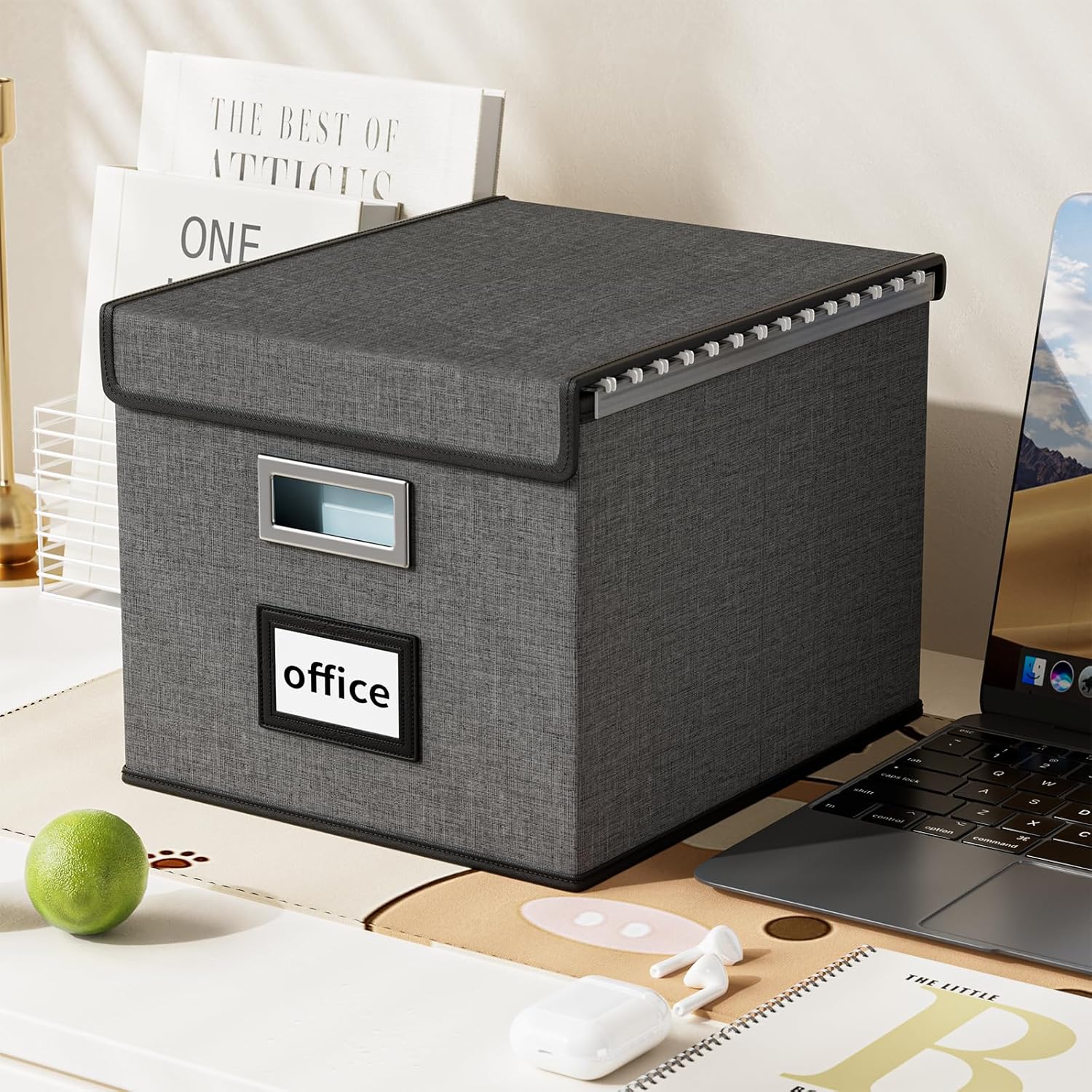 Huolewa File Organizer Boxes with Lids, Linen Office Document Storage Boxes, Filing Boxes, Decorative Small File Boxes for Hanging Files with Plastic Slide for Office/Cabinet/Decor/Home