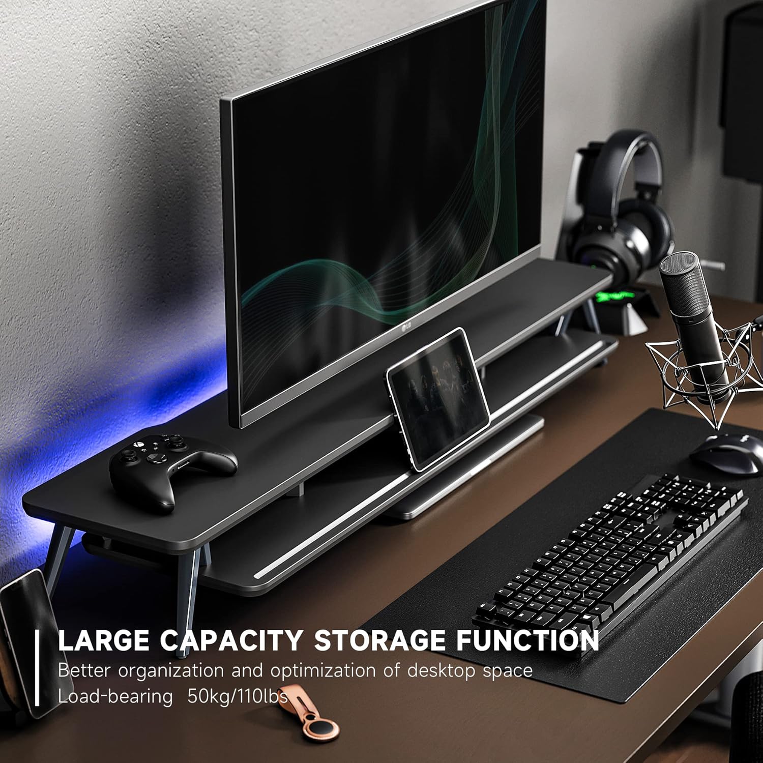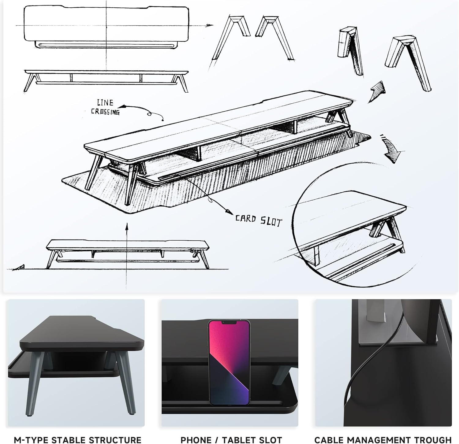 - 【2 TIER DESKTOP ORGANIZER】At longest 42.5inch wide,longer size with more space. This laptop riser is big enough to support two monitors. It has 1 universal device holder slot and 3 high capacity compartments. You can easily store your office accessories & supplies under your monitor stand to keep your desktop tidy. Our monitor stand rise comes with cable management slots that can make your cord stay organized.