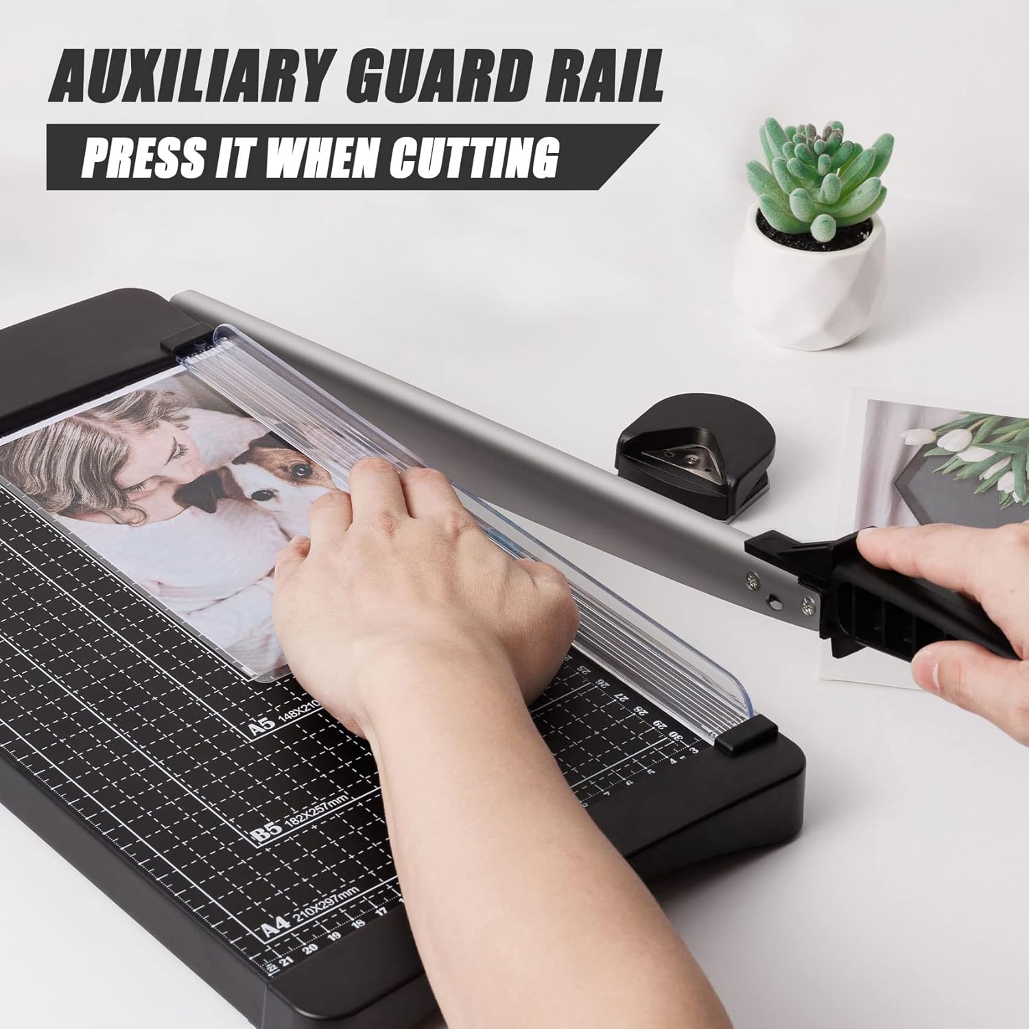 - Cut With No Effort : Upgraded steel blades cut paper smoother and more straight; Ergonomic design arm and long handle, the guillotine paper cutter saving more effort when cutting paper; Paper cutter range : A3 B4 A4 B5 A5 B6 B7 and etc