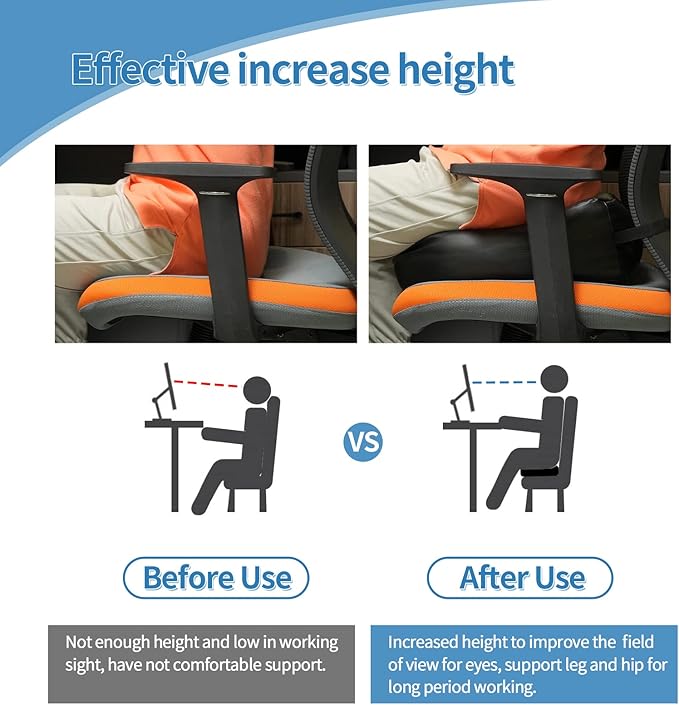 - [Effectively Support] The 6inch Thick cushion is filled with high-density, fast-rebound PP cotton which makes it perfect for use as a booster seat for adult. Its not easily deformed, so it can be used on any seat without losing its shape.You can feel sufficient elasticity and won't sit at the bottom. This office chair booster seat for adults could relieve the pain of sciatic nerve, tailbone and lower back.