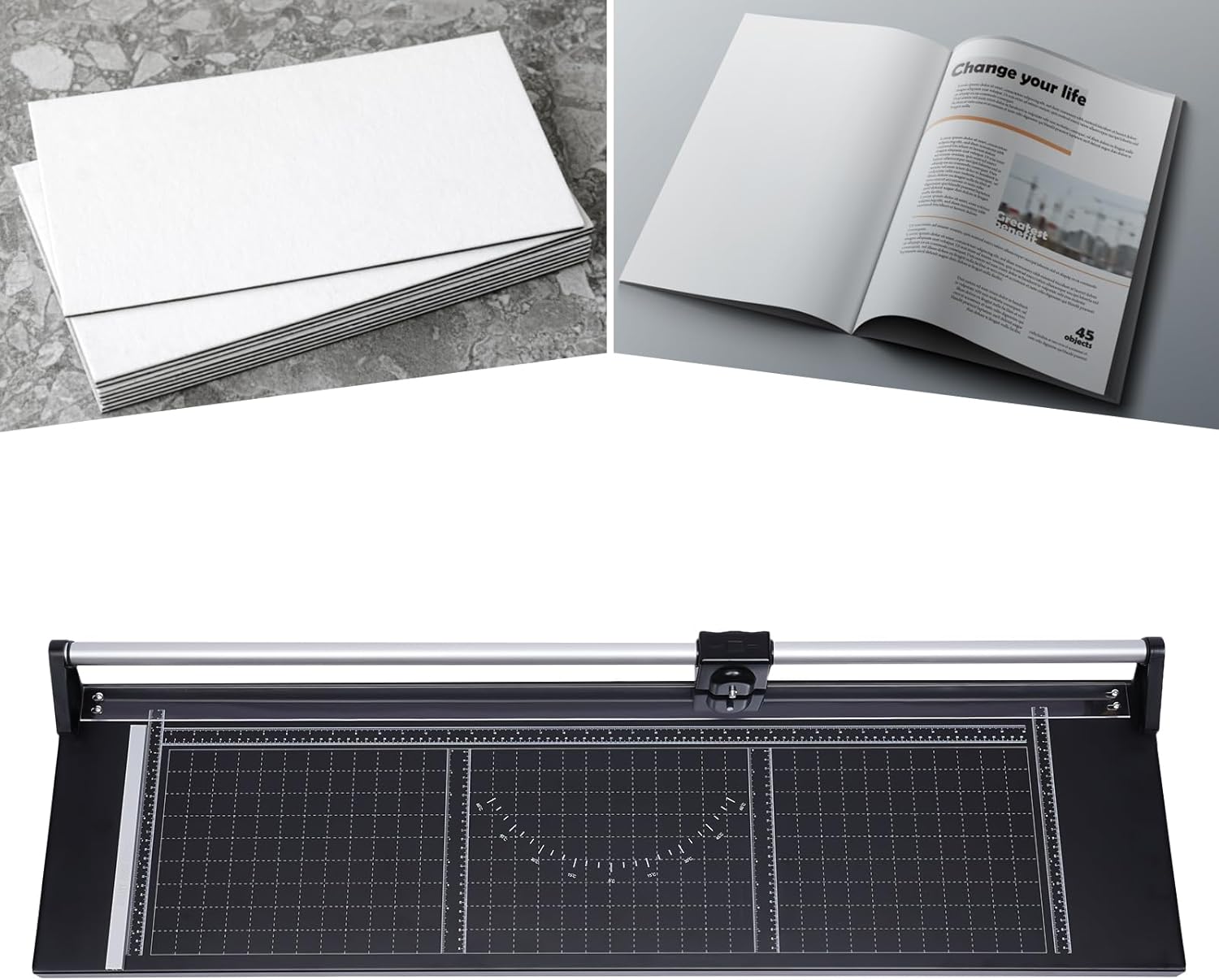 - 【Accurate Cutting】: Magnetic positioning ruler, paper pressing wheel on the blade, and paper pressing ruler ensure that the paper is flat and stable, making cutting more accurate. In addition, the clear scale in the horizontal (visible cutting length: 96.5cm/38 inches) and vertical (visible cutting width: 30.5cm/12 inches) directions also allows you to make a precise cut, and you can also use angle guidelines to cut 0°, 15°, 30°, 45°, and 60° corners.