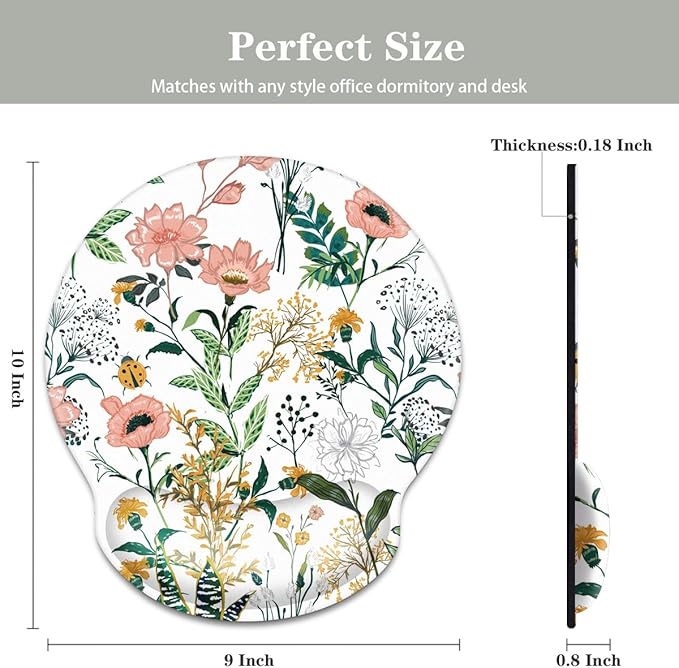 - Design Mouse Pad for Women: Measure 10 x 9 x 0.18 Inch, wrist support part is 0.8 Inch, perfect size for work and game. Cute pattern design adds personality to your office, perfect for all style desktop, office, home, computer, keyboard and mice.