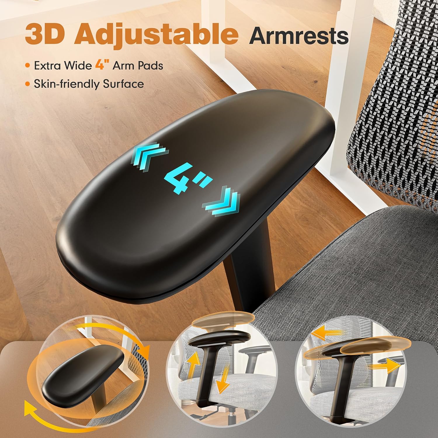 - ă4.5â" Wider Big Arm Padsă3-D fully adjustable armrests raise up and down, pivot in and out, and shift forward and back, to provide steady support for your arms so your shoulders can remain in a relaxed position.