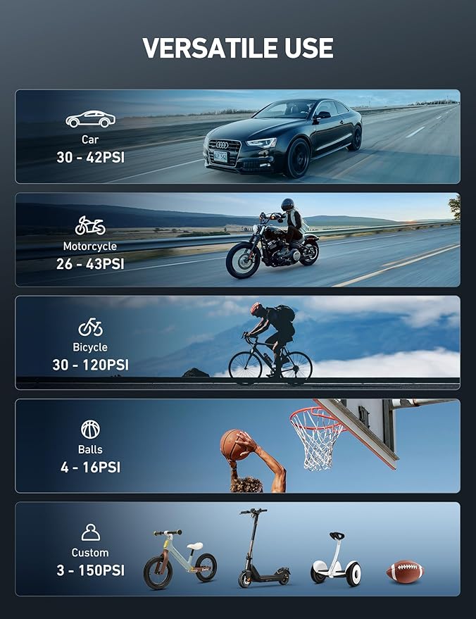 - EASY TO USE: You can choose 4+N smart modes (car, motorcycle, bicycle, ball, and custom) based on your various inflation needs. You can also easily choose between 4 pressure units as needed (PSI, Bar, kPa, kg/cm²). The custom mode allows you to freely preset the desired pressure value (3-150PSI) based on the inflatables you want to inflate.