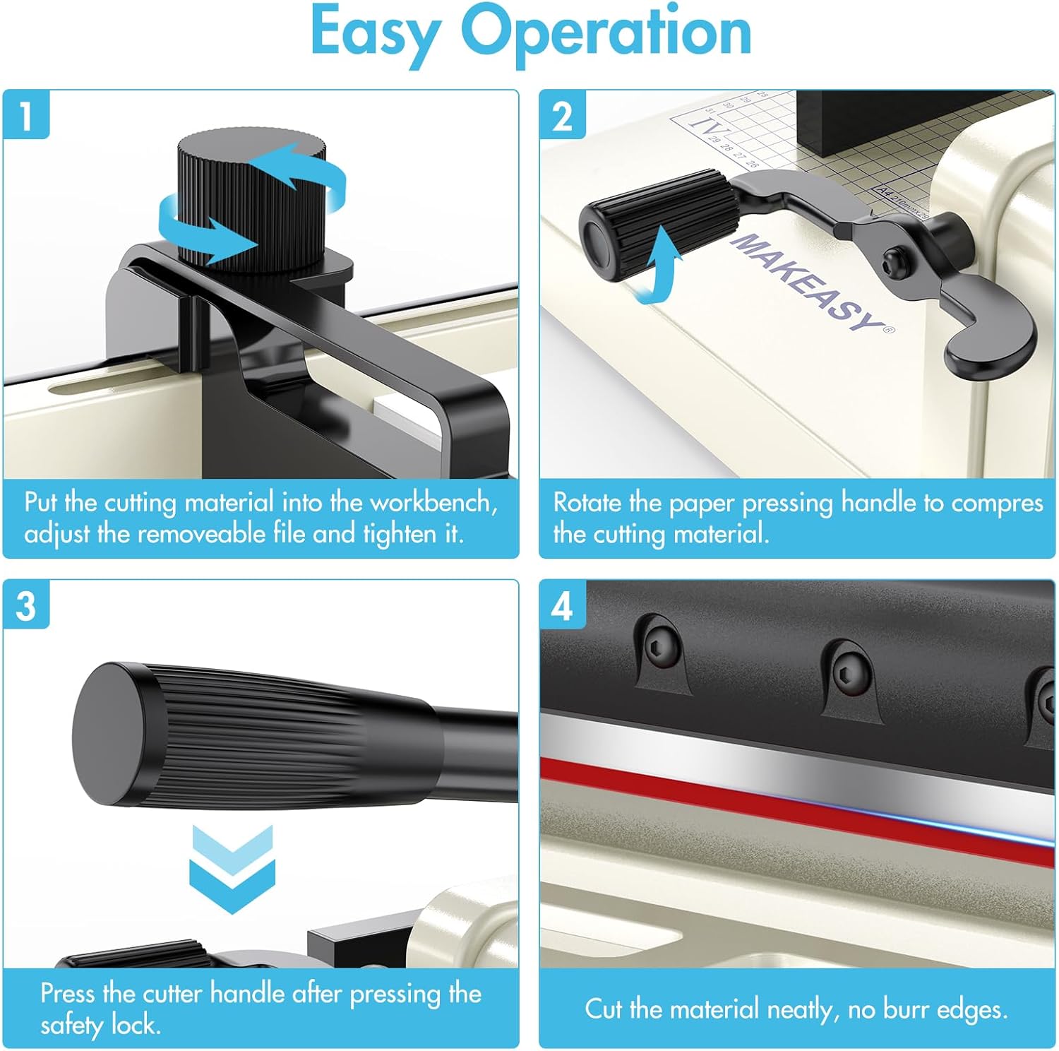 - [Versatile Cutting Capacity] This robust paper cutter effortlessly slices through up to 400 sheets (1.5" thick, A4 size), as well as materials such as PVC, leather, and fabric, meeting diverse cutting demands in homes, offices, schools, and print shops