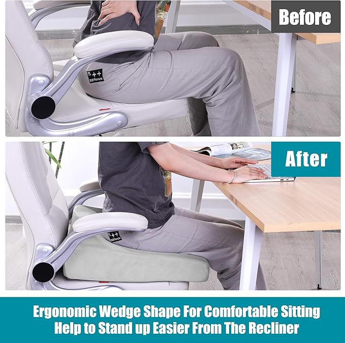 - 【Wedge Design for Relieve Pressure on Thighs】Featuring a scientific wedge-shaped silhouette, the ergonomic design supports your thighs and hips without putting pressure on your thighs, helping you to sit upright in the chair, keep your legs in a natural position, and relieve the stress of sitting for long sitting.