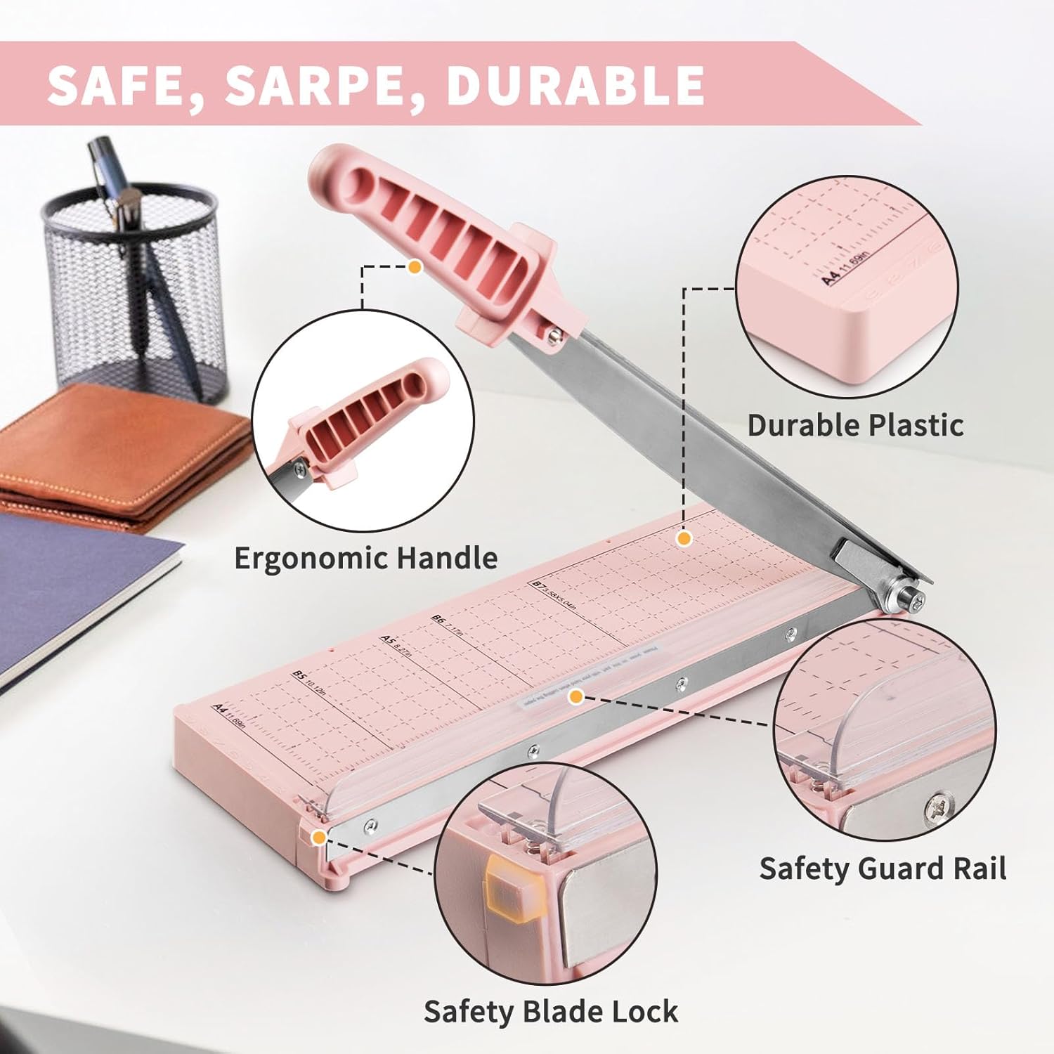 - [PORTABLE & USER-FRIENDLY] With a sturdy yet lightweight plastic base, storage and mobility are a breeze. The ergonomic handle brings comfort and enhanced grip, making paper-cutting a piece of cake. Convenience at your fingertips