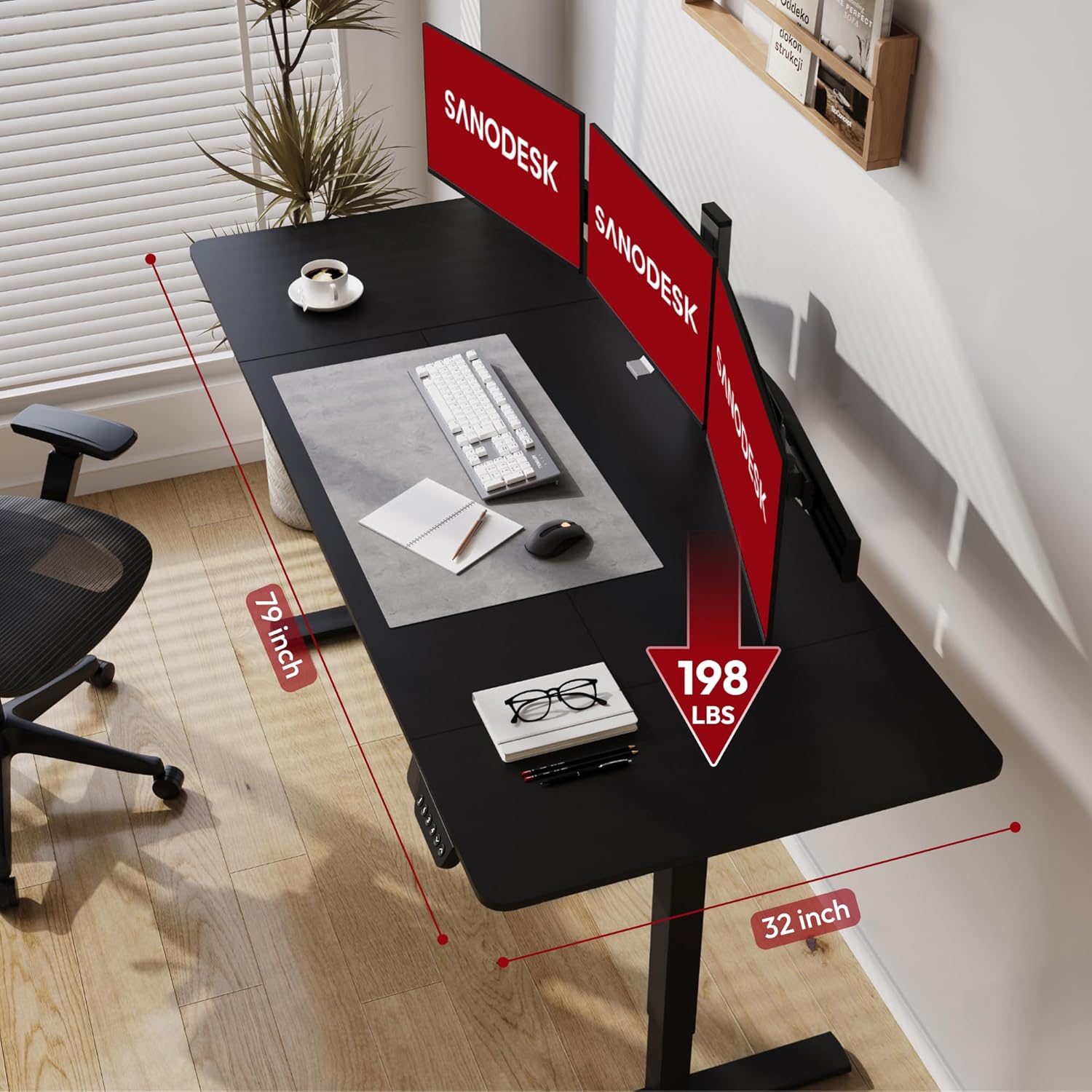 - Ergonomic Workspace: The spacious 79” x 32” adjustable desktop offers a roomy setup that promotes an ergonomic workspace.