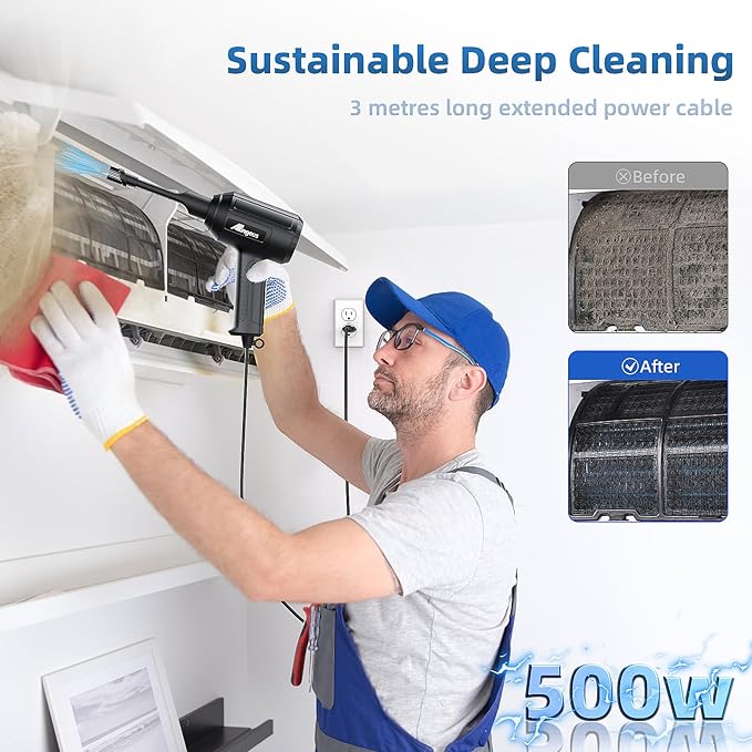 - Super Strong Blowing: The AC Air Duster has a rated power of 500W and uses a brushless DC motor, which has stable performance and long service life. The blowing force can reach about 170g at the highest speed. After connecting to the power supply, it can provide continuous and strong blowing ability, and is equipped with a cleaning nozzle for efficient cleaning.