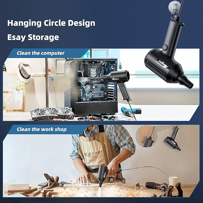 - Lightweight and Portable: The Electric Air Duster weighs 670 grams and measures 7.9inch*5.5inch*2.9inch. There is a small round hole on the handle, which is suitable for hanging on the wall for storage. ATEngeus blowers can be reused, which can save you more money and provide a more environmentally friendly experience compared to buying disposable compressed air cans.