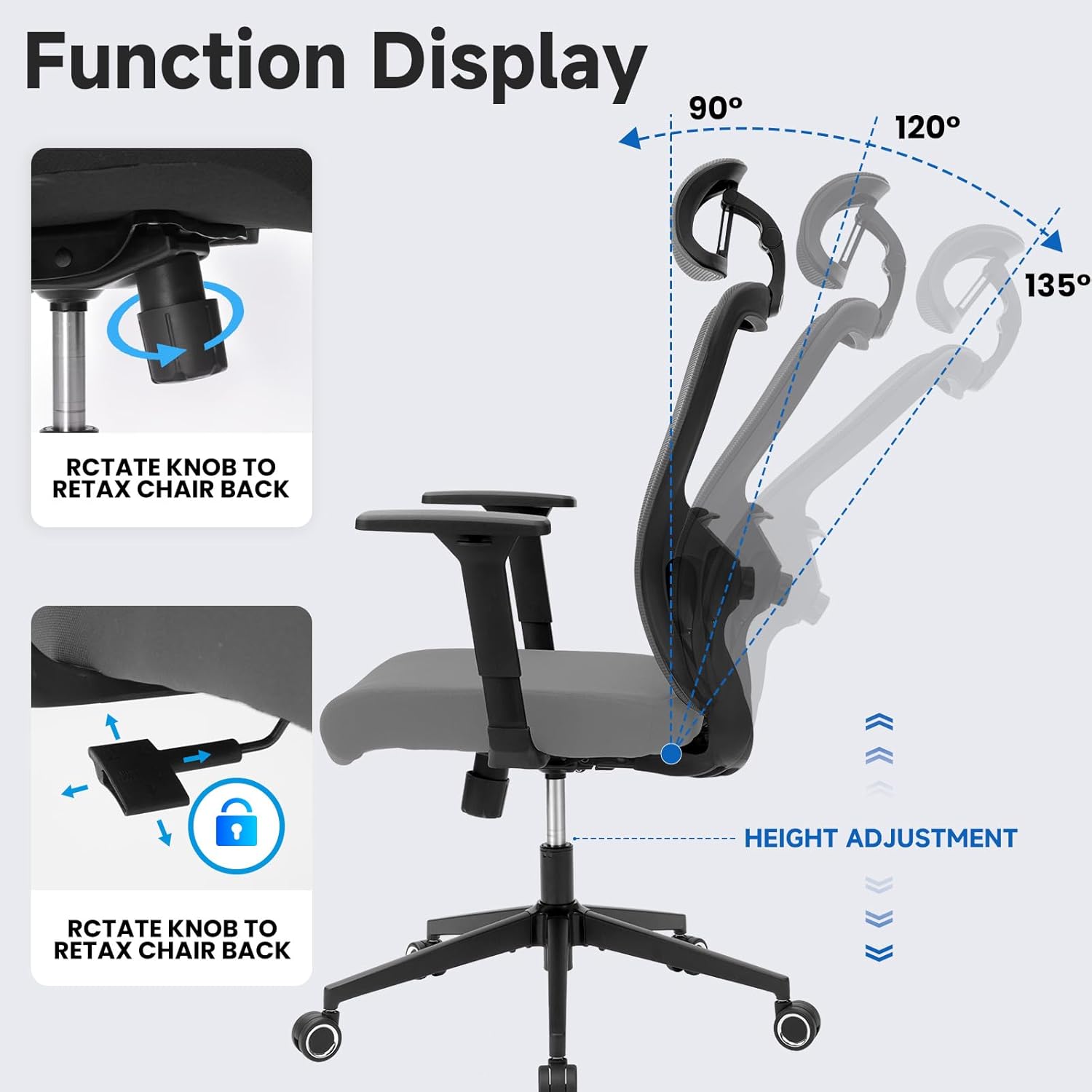 - ăFunction and DesignăErgonomic design helps the backrest has prominent lumbar support to help you maintain a relaxed posture during long hours of work or study, comfortable mesh with back support points can fit the natural curvature of the spine