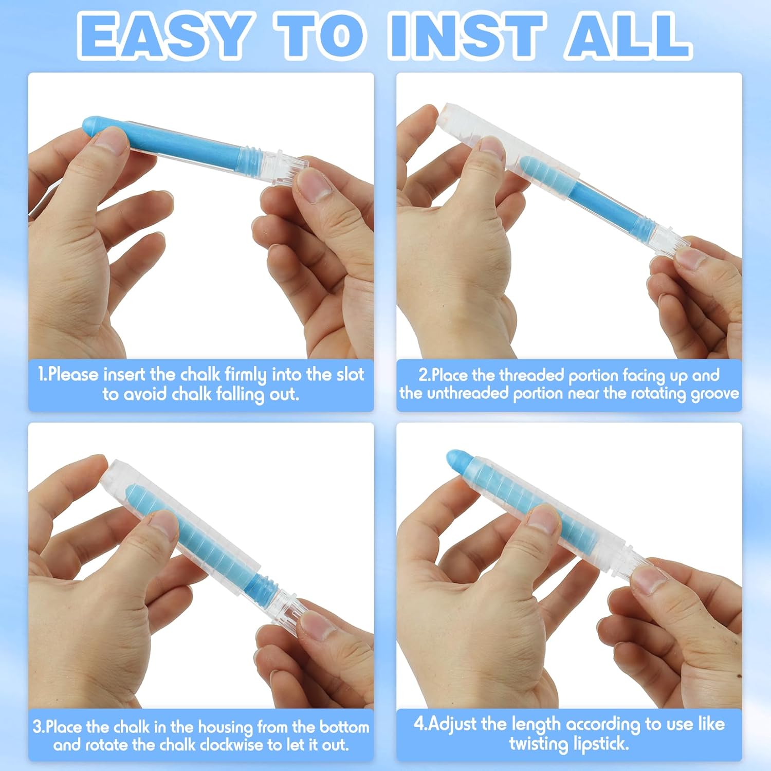 - 【Easy to Use】- Our dustless chalk comes with an adjustable chalk holder that rotates like a lipstick, kids won't break chalk or make a mess anymore. The dust free colored chalk set has an overall length of 3.9 inches and is easy to hold and comfortable in your hand perfect for kids to use and adults to use as well. Note: Dustless chalk should be wiped with a magnetic board eraser. To clean the chalkboard, wet a damp cloth and wipe the surface of the board, then dry it with a dry cloth.