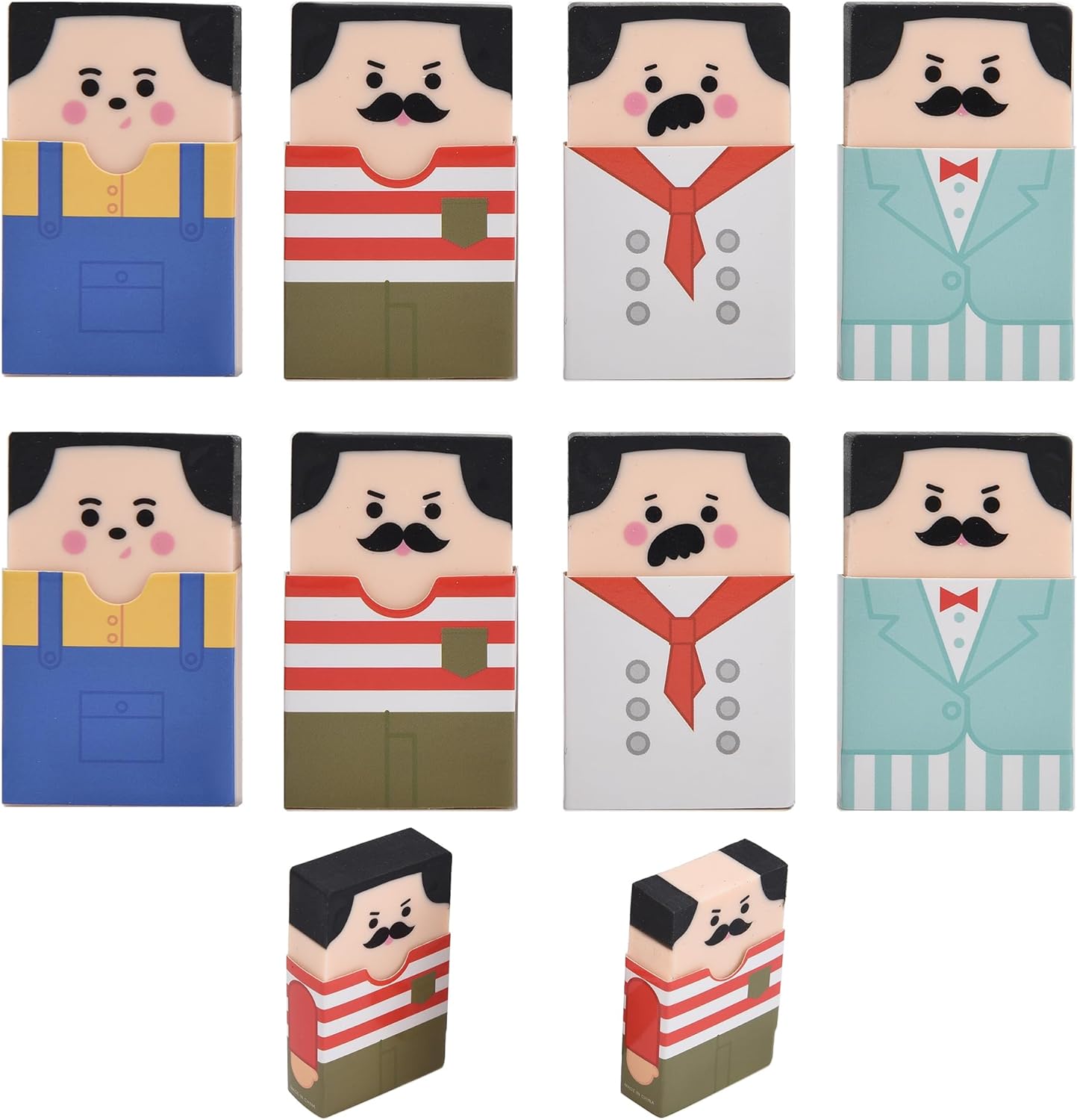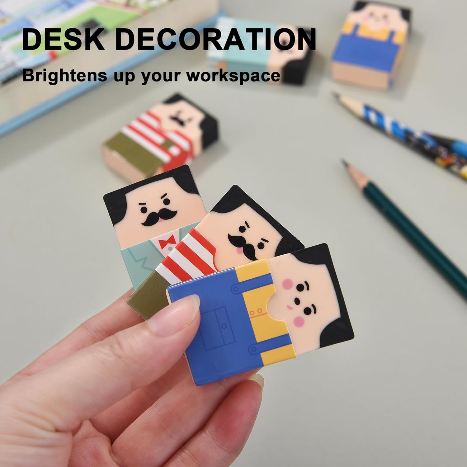 - Humorous Design: Features 8 playful erasers shaped like men whose hair gradually disappears, revealing a comical bald appearance