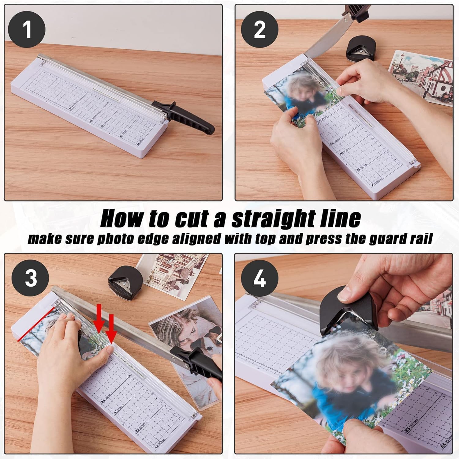 - EFFORTLESS SHARP CUTTING:Ergonomic Design arm and long handle, more effortless when cutting paper; Upgrade steel blade cut paper more neatly and smoothly;Trimmers range: A3 B4 A4 B5 A5 B6 B7