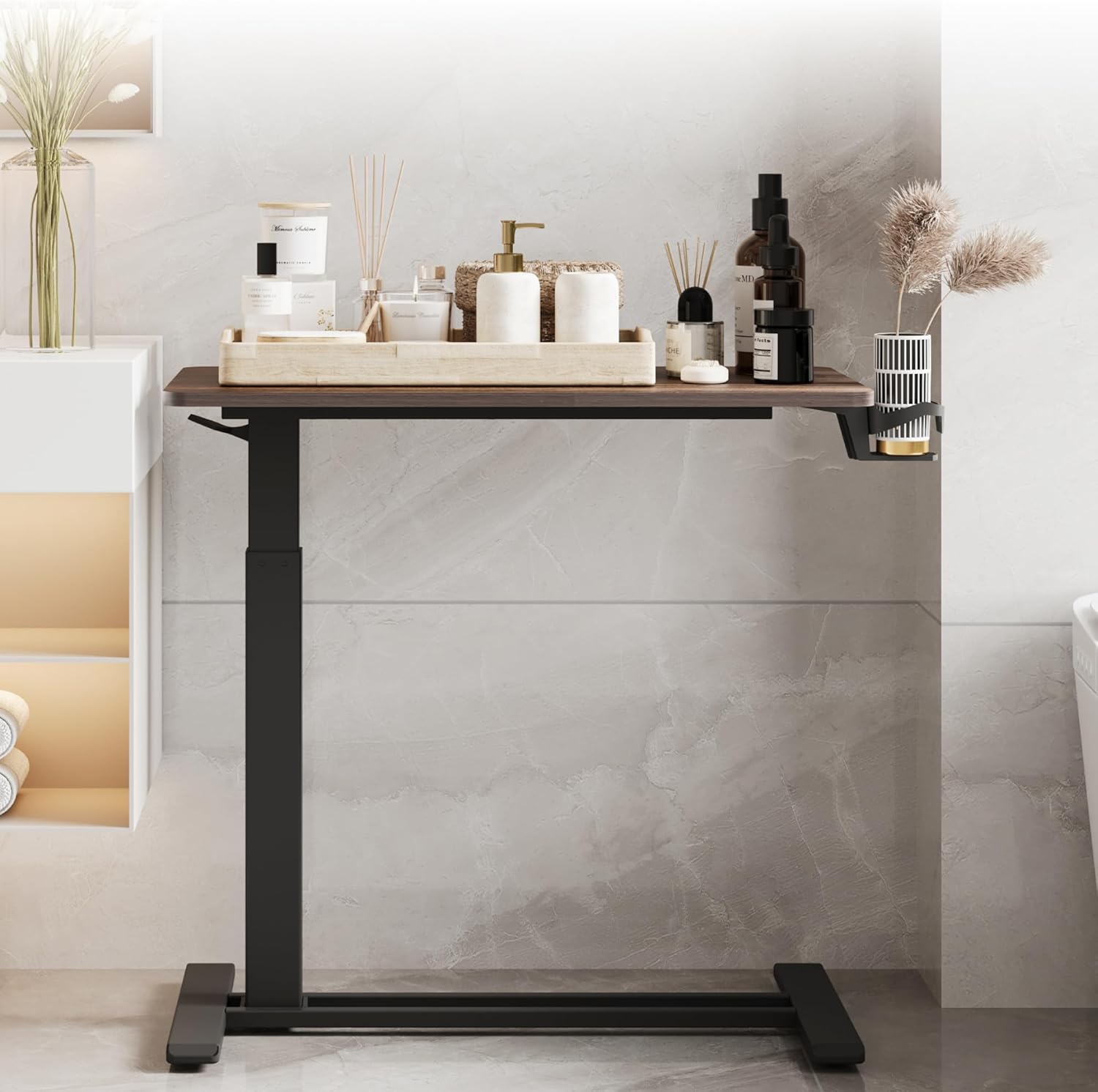 - ADJUSTABLE HEIGHT - The mobile standing Desk features a built-in gas spring, allowing effortless height adjustment to suit various bed heights and your personal preferences. Whether you prefer to sit or stand, this desk adapts seamlessly to provide optimal comfort and convenience.