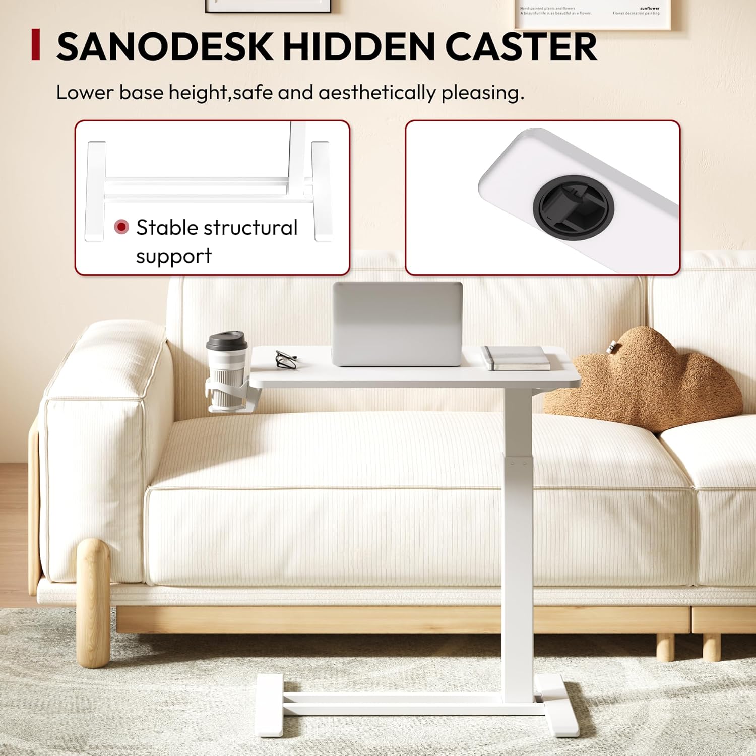- Portable and Mobile – Designed for convenience, this rolling computer desk is ideal for work or study, whether at home or in the hospital. Its low-profile base with smooth-rolling wheels allows easy movement and tucks under furniture as low as 1.2 inches, saving space and enhancing adaptability.