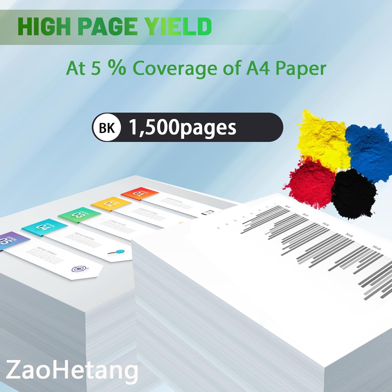- Page yield: 1,500 pages per black toner cartrdges 5% coverage