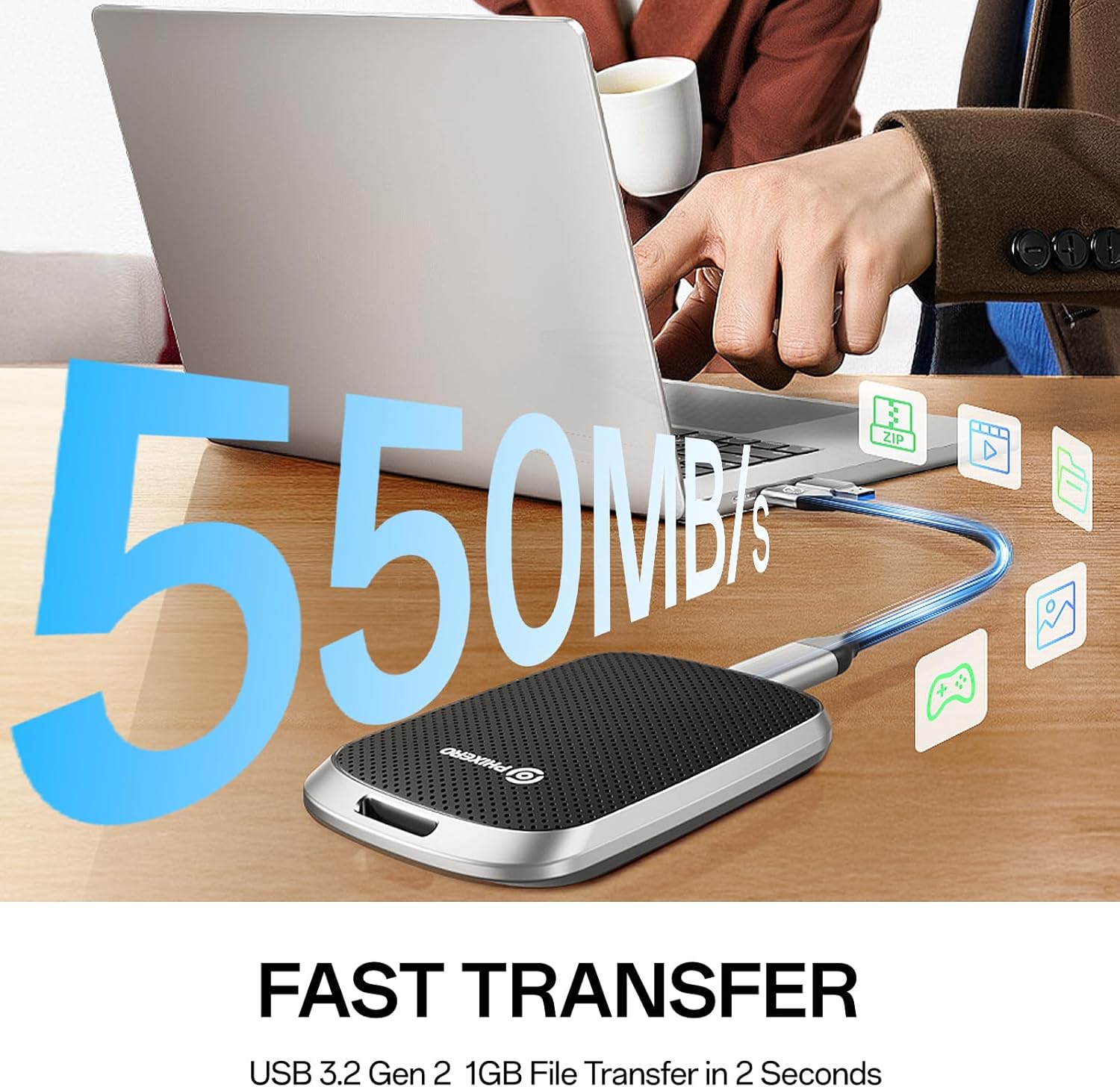 - 【Sturdy and Portable】PHIXERO P5PLUS External Solid State Drive adopts anti-drop, anti-vibration, anti-dust, and solid one-piece aluminum alloy frame with high strength and durability, making this portable hard drive keep the drive almost silent when running. The mini design makes it very convenient for you to carry and use. It can be easily put into a briefcase or a pocket of clothes.