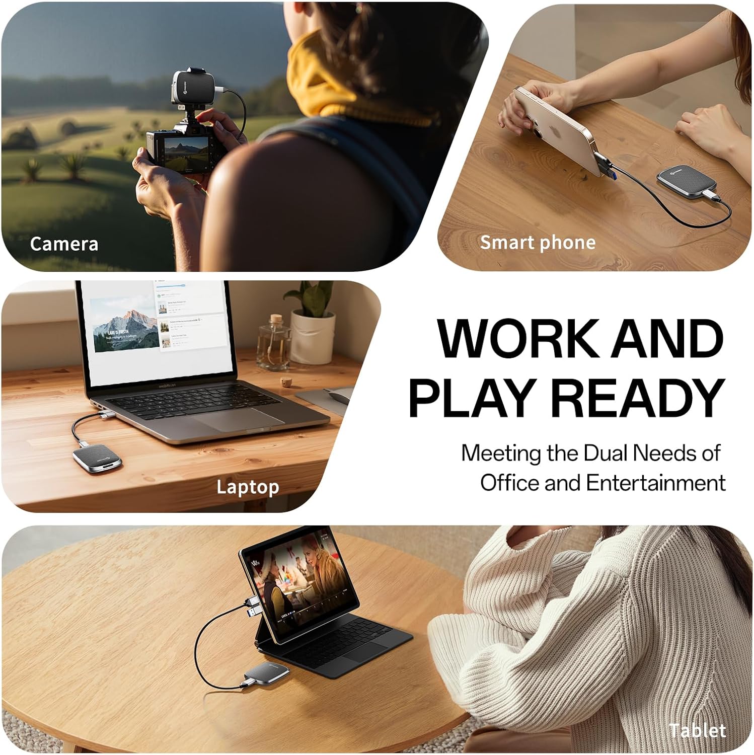 - 【Seamless cross-device use】 Whether you are working or creating for entertainment, you can control your content at any time through your smartphone, PC and other devices with the USB C&A cable. You can connect the PHIXERO P5PLUS Portable SSD to your devices without any operation. It is convenient for everyone to use their mobile phones to directly read files for file sharing, data transmission, and video playback while working or studying.
