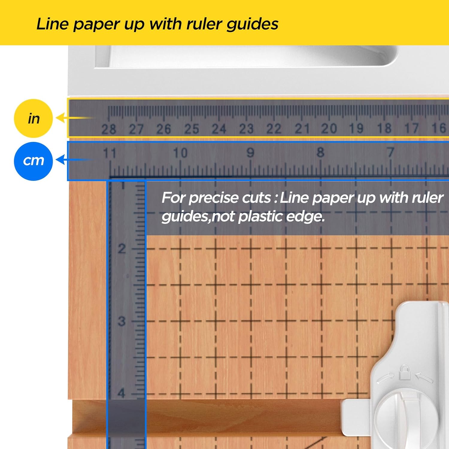 - Precision Cutting with Adjustable Guide: The alignment grid ensures precision, while the adjustable paper guide secures the paper in place for accurate cuts. The dual-scale ruler, marked in inches and centimeters, aids in measurement before cutting.