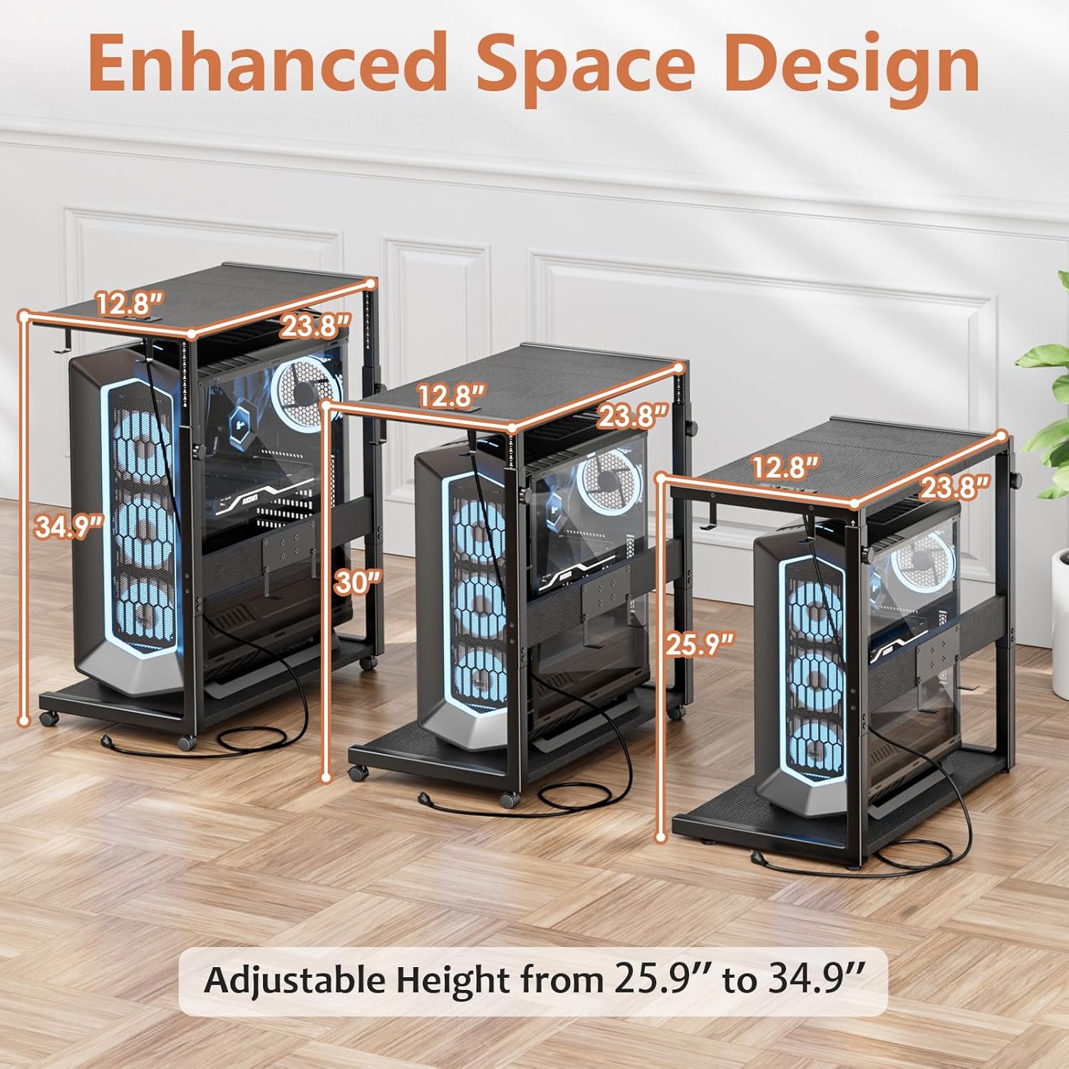 - Ergonomic Height Adjustment: This CPU stand offers a wider range of adjustable heights, seamlessly adjustable from 25.9 inches to 34.9 inches. It is suitable for standing desks, gaming setups, or side table use. By keeping your PC elevated, it protects it from floor dust and spills.