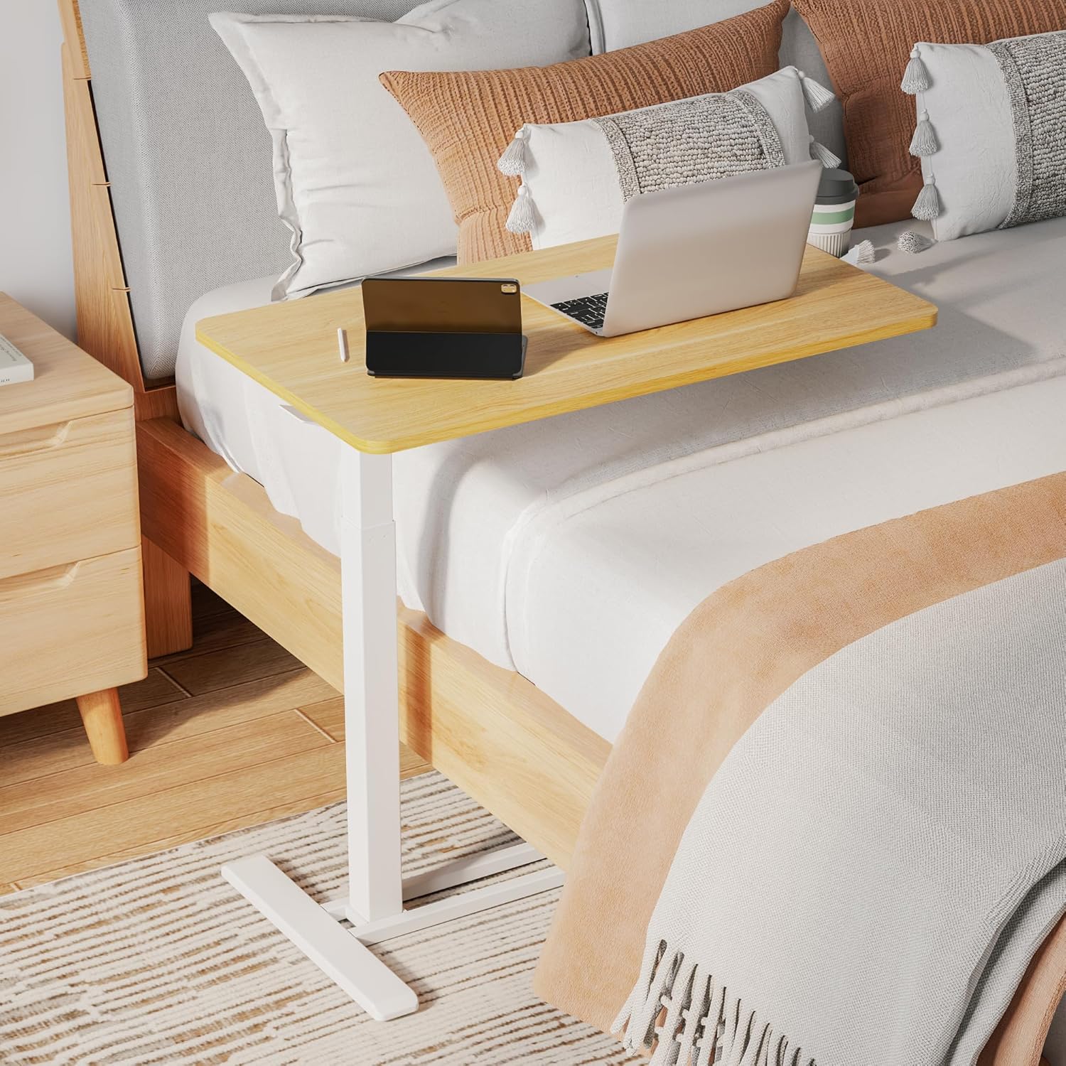- ADJUSTABLE HEIGHT - The mobile standing Desk features a built-in gas spring, allowing effortless height adjustment to suit various bed heights and your personal preferences. Whether you prefer to sit or stand, this desk adapts seamlessly to provide optimal comfort and convenience.