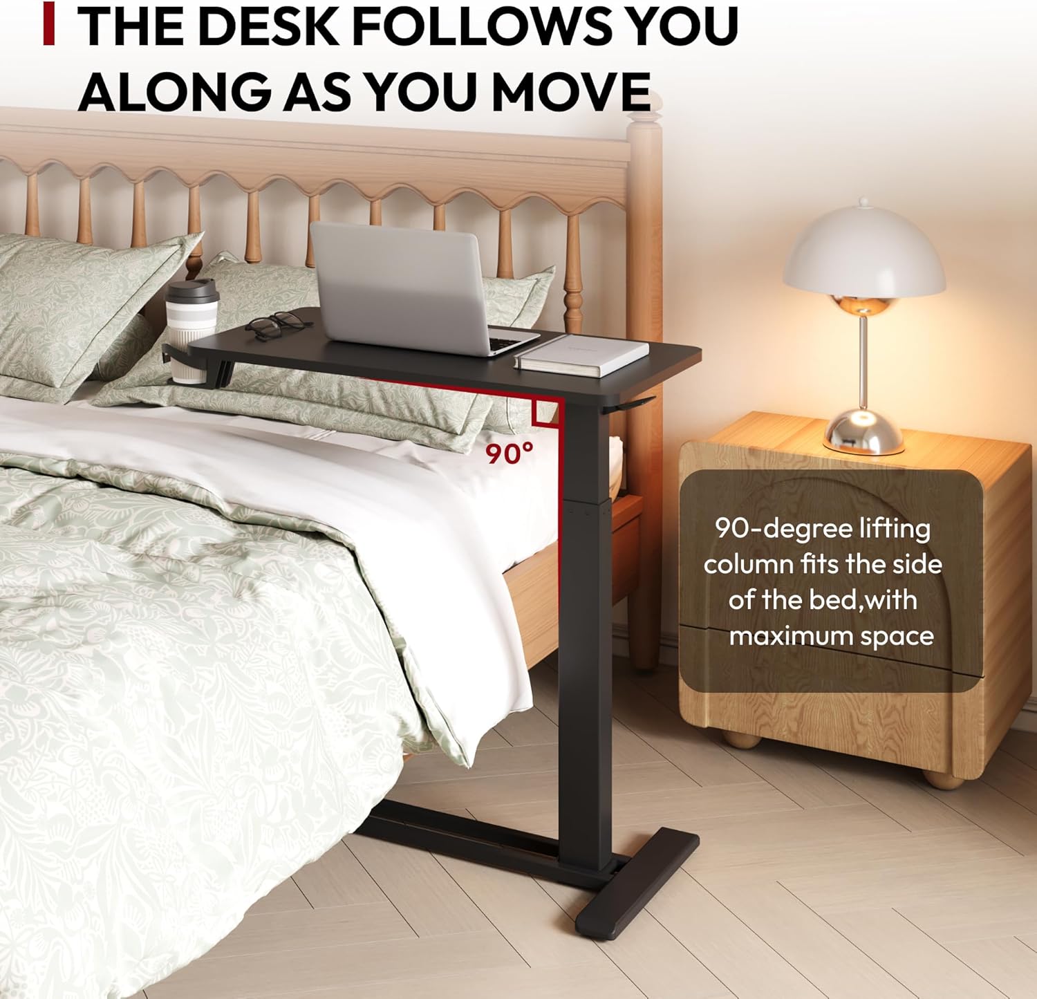- ADJUSTABLE HEIGHT - The mobile standing Desk features a built-in gas spring, allowing effortless height adjustment to suit various bed heights and your personal preferences. Whether you prefer to sit or stand, this desk adapts seamlessly to provide optimal comfort and convenience.