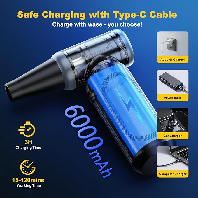 - [Superior Battery Life]: Equipped with a high-capacity 6000mAh battery, this mini electric compressed air blower can run continuously for 120 minutes on a single charge. It comes with a USB-C fast charging cable and can be charged by a computer, mobile power supply, car charger, or adapter. The electronic air blower/air duster is gear replacement for canned air, and it's energy savings and Eco-Friendly.