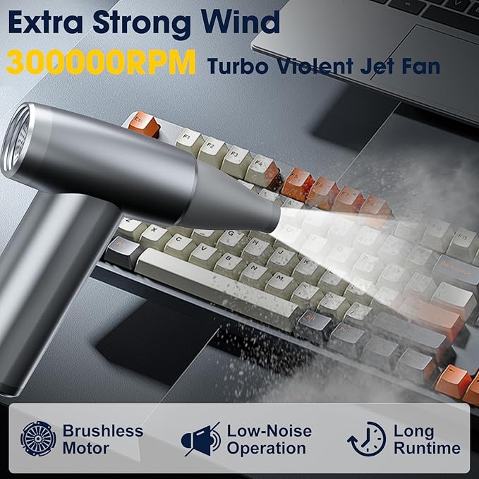- [300,000 RPM Super Speed & Stepless Speed Regulation]: This compressed air duster features a maximum rotation speed of up to 300,000 RPM and offers stepless speed adjustment. It can effortlessly clean tiny dust particles from door frames, toy models, fan blades, PCs, keyboards, and more. You can freely adjust the wind speed to meet your various cleaning needs.