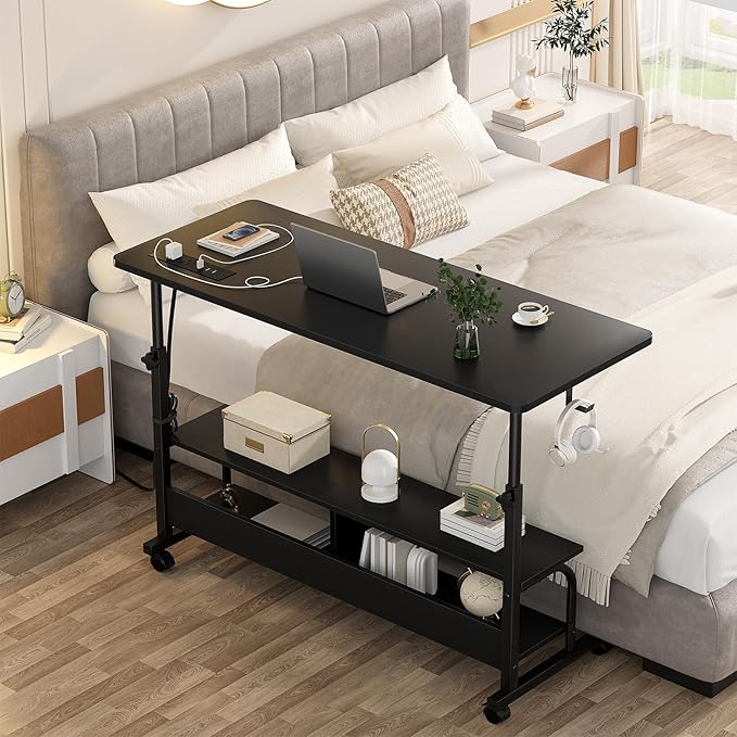 - 【Multi-Function】The rolling computer desk equipped with 4 high-quality smooth rotary wheels and non-slip footpads, you can move the desk wherever you want or fixed in one place, it offers stable moving and fantastic working experience. 2 tier opening storage shelves are convenient for you to place daily necessities and other items. Two extra desk iron hooks can save the most of your space.