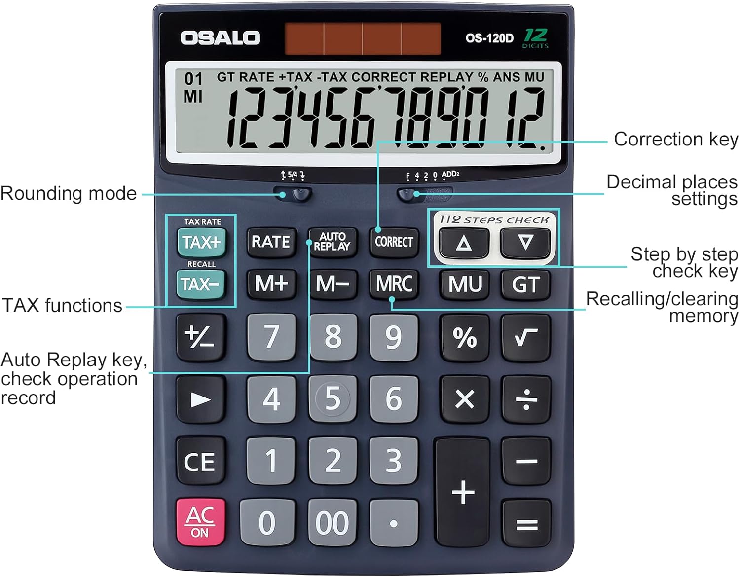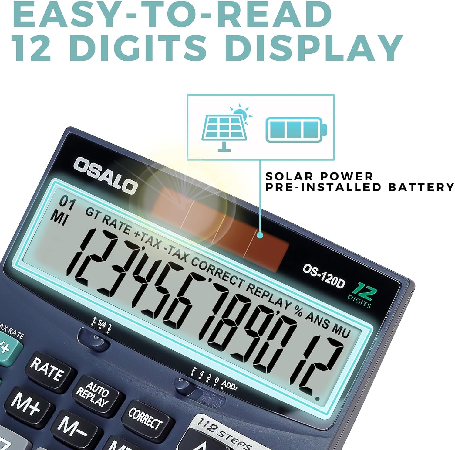 OSALO 12 Digits Desktop Calculator Extra Large LCD Display with VAT Tax Big Button, Dual Solar Power and Battery, Basic Calculator for Office, Home, School (DJ-120D Deep Blue)