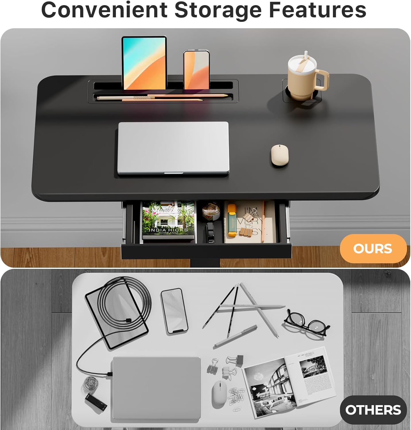 Mobile Standing Desk with Drawer, 35" Small Standing Desk with Cup Holder, Rolling Laptop Cart on Wheels, Height Adjustable Table with Storage for Home Office, Black