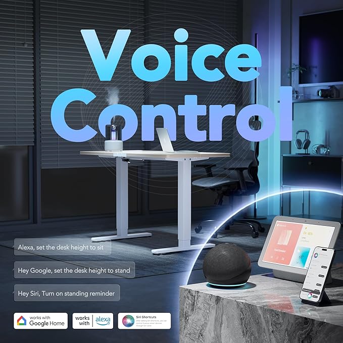 - SMART CONTROL: Experience the new smart electric standing desk that uses an App(Ergo BQ) to find your perfect sit-stand height. Enjoy hands-free control with Alexa, Google, and Siri for effortless ergonomic comfort.