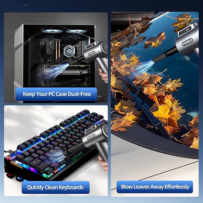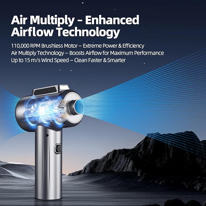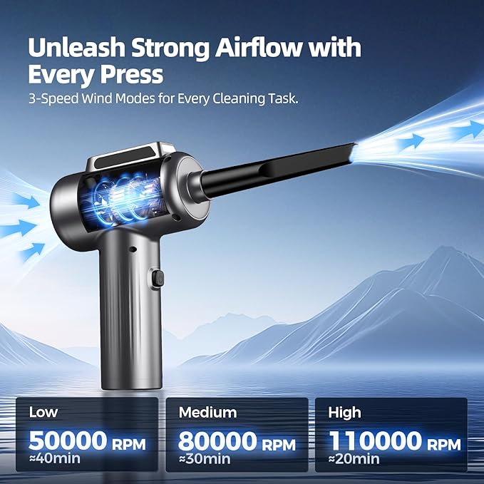 - 【Powerful Airflow for Deep Cleaning】 Deliver ultra-strong airflow up to 110,000RPM—this electric air duster easily removes dust from keyboards, laptops, cameras, and car vents. A perfect compressed air alternative, ideal for cleaning sofas, window tracks, and hard-to-reach corners without pressure loss.