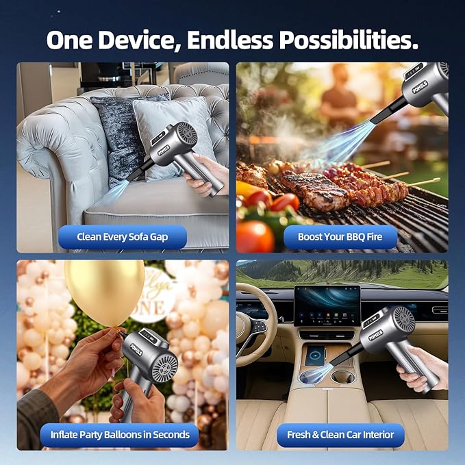 - 【Rechargeable & Long-Lasting Battery】 Built-in high-capacity rechargeable battery supports long cleaning. Type-C fast charging ensures convenience anywhere—clean car interiors, fans, or shelves and boost BBQ fire. Perfect for blowing up balloons, air mattress and swim rings with powerful airflow.