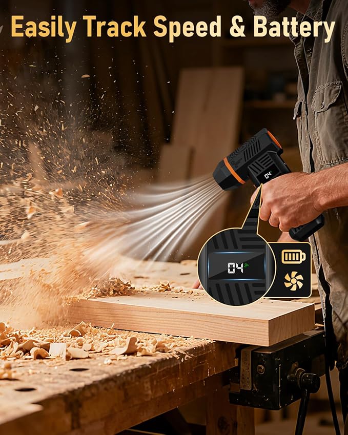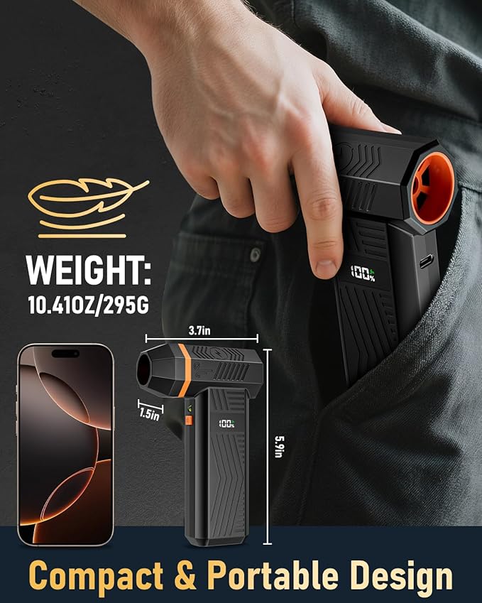 - [Screen Display & Multi-Functionality] This compressed air duster is equipped with a high-definition screen display and an LED light, making it easy to track the battery level & speed settings, and enables to effortlessly clean in dark environment. The turbo jet fan for air dusting comes with 3 nozzles and 10 brushers, meeting for cleaning laptops, car seats, and household surfaces like sofas and tricky corners. A versatile solution for all your cleaning and camping needs!