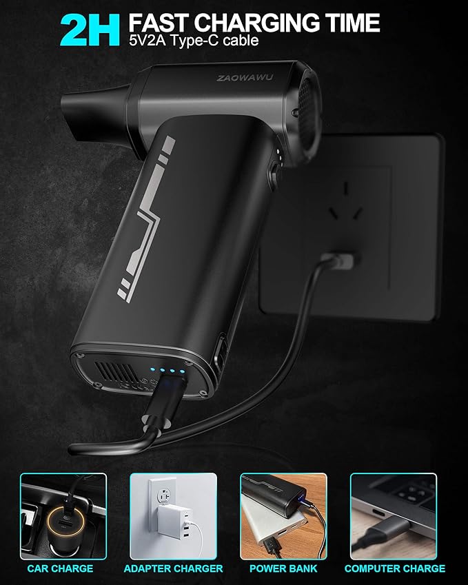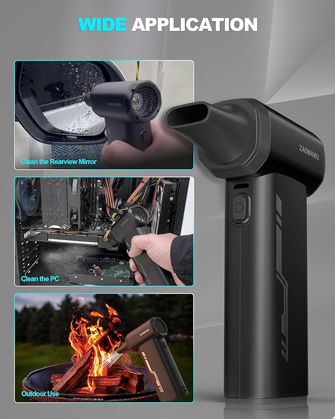 - [Turbo Fan Technology with 3-Speed Control] Featuring an advanced brushless motor, this turbo fan duster offers 3 adjustable speeds to handle everything from delicate camera lenses to heavy-duty computer tower dust. The 120-minute runtime and Type-C fast charging ensure your electronic cleaner is always ready for the next task.