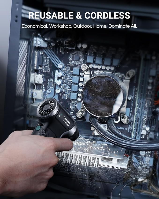 - 6 VERSATILE ACCESSORIES FOR ALL SCENARIOS:Comes with 4 specialized nozzles and 2 brush to cover every cleaning task. The flat nozzle is perfect for precision cleaning PCs, cars, air conditioners, keyboards—ideal as a computer air duster for fine dust removal;The inflatable nozzle for air beds, swimming rings, and inflatable toys; universal nozzle blowing leaves, snow, and outdoor fire starters.Plus, the soft and hard brush heads safely scrub dusty areas,enhancing the functionality of this pc air duster rechargeable.​