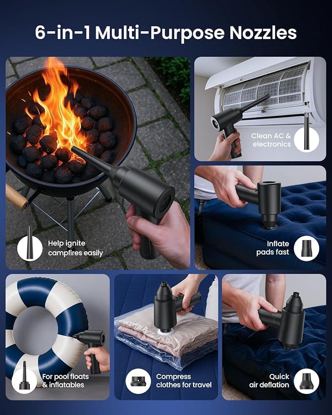 - ✅6 Nozzles for Multi-Purpose Use: Included are 6 interchangeable nozzles, used for a variety of tasks such as cleaning electronics, car vents, inflating pool floats, drying pet hair, and clearing ash. This compressed air duster is capable of adapting to countless applications.