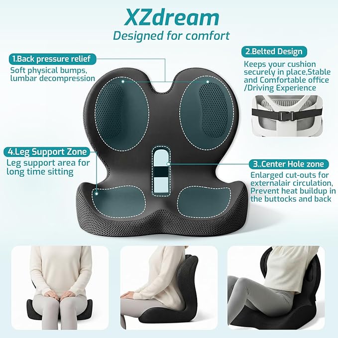 - Long Sitting Test, Designed for comfort: The cushion features an ergonomic design that has been tested for extended use by a variety of individuals. It's perfect for relieving pressure on the tailbone and lower back during long drives or extended hours at the office