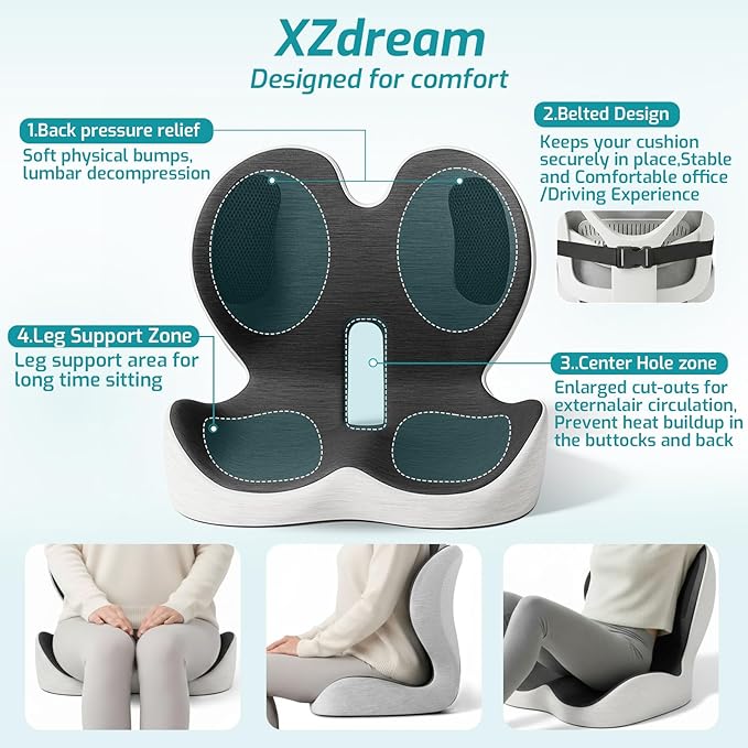 - Long Sitting Test, Designed for comfort: The cushion features an ergonomic design that has been tested for extended use by a variety of individuals. It's perfect for relieving pressure on the tailbone and lower back during long drives or extended hours at the office