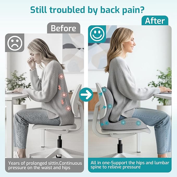 - One Cushion, Double Comfort: Our uniquely molded one-piece design combines lumbar support and seat cushion comfort, offering comprehensive support that alleviates discomfort from prolonged sitting. Say goodbye to hip and lower back discomfort, and enjoy all-day comfort