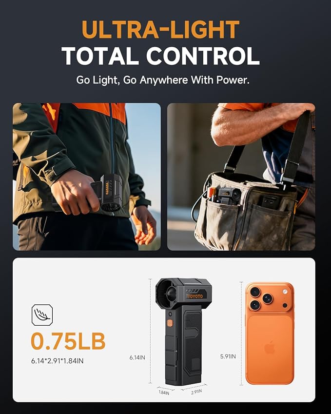 - 【Pocket-Sized Powerhouse】Despite its impressive power, this mini jet blower maintains a remarkably lightweight and portable design. Weighing just 0.75 lbs (about 340 grams) and shaped for ergonomic comfort, it's effortless to use one-handed. Complete with its own compact storage pouch, it slides easily into a backpack or tool kit—bringing pro-level cleaning anywhere. Perfect for home, car, travel, camping, or any on-the-go task.
