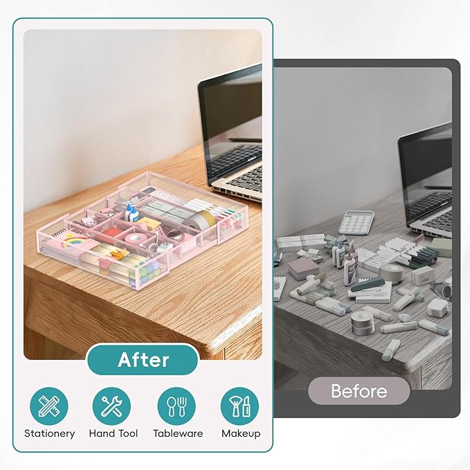 - Expandable Drawer Organizer: The Reeplan drawer organizer tray features 2 extendable sliding compartments, designed to fit any drawer size, with an adjustable length ranging from 8.74 inches to 16 inches. This drawer organizer is especially suitable for your desk, making it the perfect office supply organizer and an ideal choice for your office accessories.