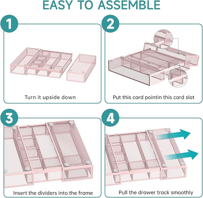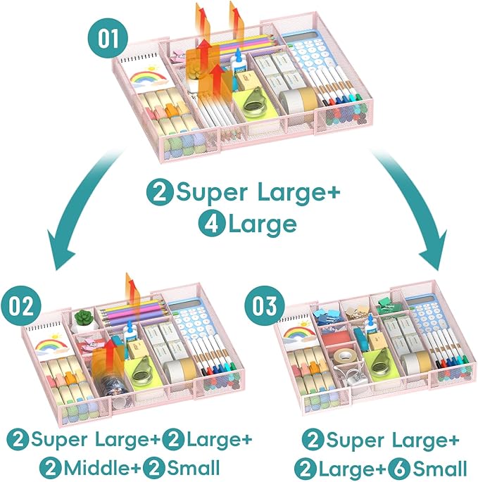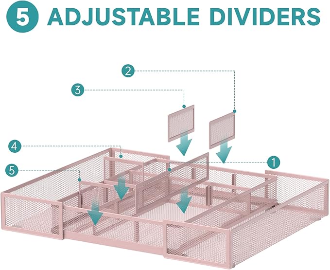Expandable Desk Drawer Organizer Tray with 10 Adjustable Compartments, Metal Mesh Office Drawer Organizer, Versatile Desk Organizer for Home, School Supplies, Makeup Vanity & Jewelry (Pink)
