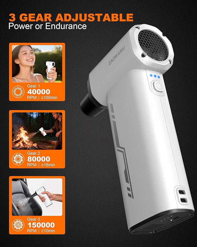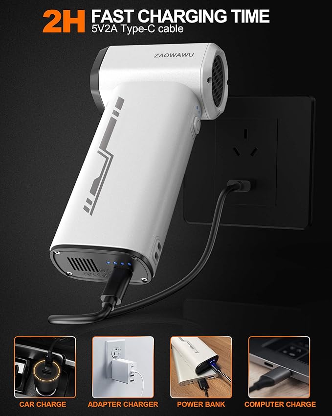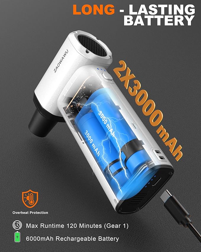 • [Turbo Fan Technology with 3-Speed Control] Featuring an advanced brushless motor, this turbo fan duster offers 3 adjustable speeds to handle everything from delicate camera lenses to heavy-duty computer tower dust. The 120-minute runtime and Type-C fast charging ensure your electronic cleaner is always ready for the next task.
